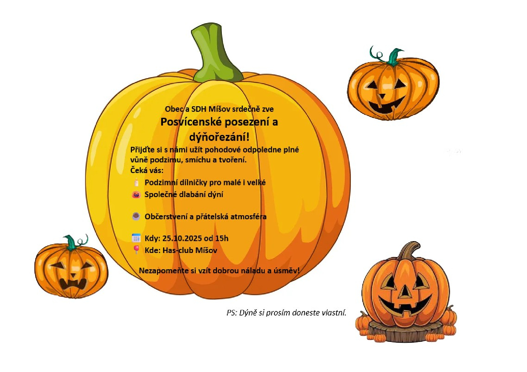 Vážení spoluobčané, SDH Míšov pořádá v sobotu 25.10.2025 od 15h posvícenské posezení v Has-clubu s podzimní dílnou pro děti - dlabání dýní, podzimní tvoření. Dýni si prosím přineste každý svou. Těšíme se na všechny!